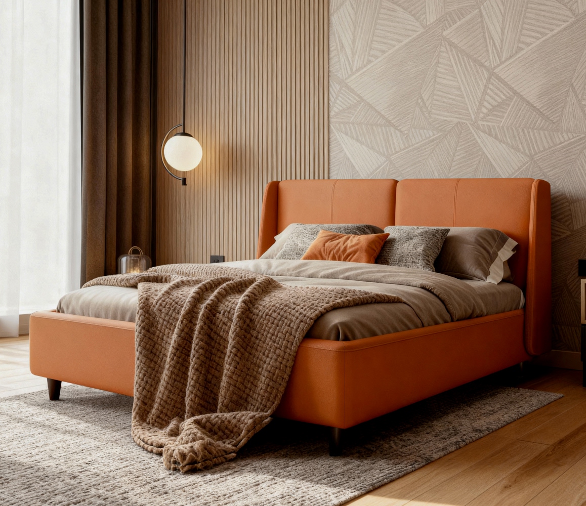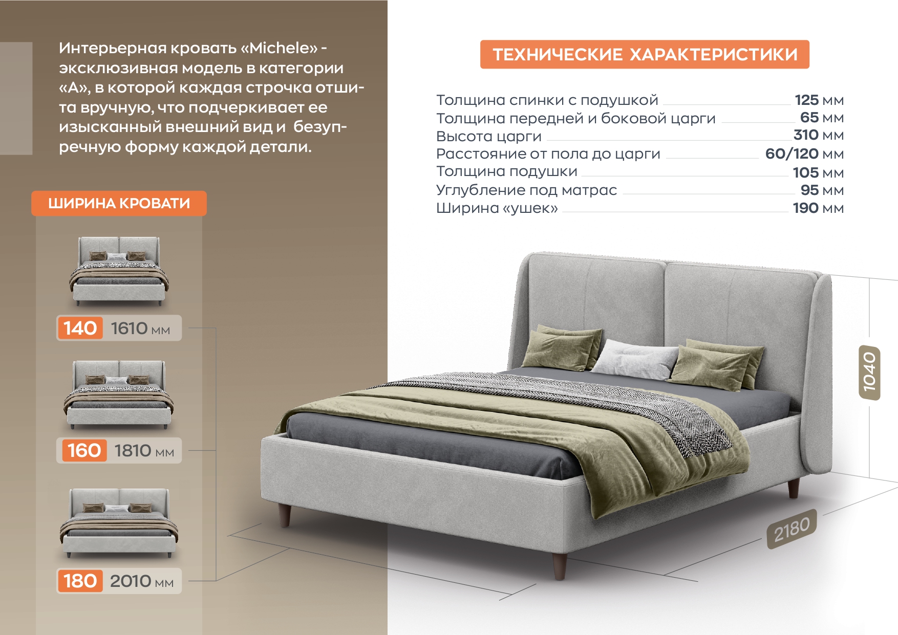 Интерьерная кровать «Michele» - эксклюзивная модель в которой каждая строчка отшита вручную, что подчеркивает ее изысканный внешний вид и безупречную форму каждой детали. Ножки в комплекте: металлические черные