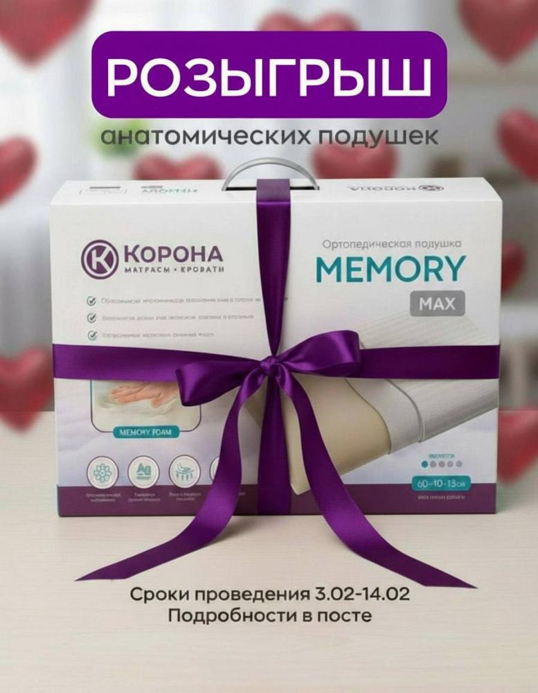 🎁 Главный приз: Две анатомические подушки MEMORY MAX с эффектом памяти — идеальная забота о здоровом сне и отдыхе для вас и вашей второй половинки.