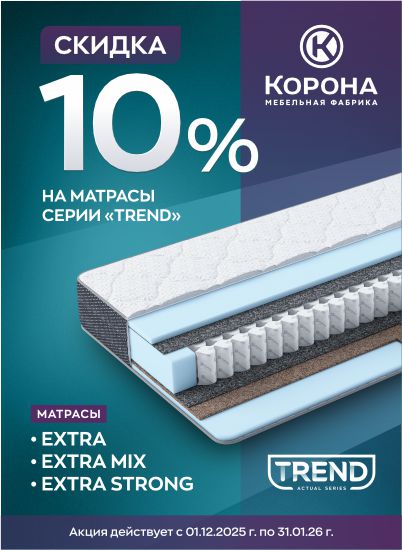 Получите скидку 10% на матрасы повышенной комфортности серии «Trend» в период с 1 декабря 2025 по 31 января 2026.